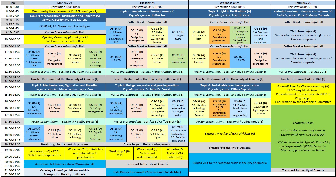 | (A) Paraninfo – capacity for 700 attendees | (B) Salón de Grados – capacity for 180 attendees | (C) Economicas – capacity for 130 attendees | (D) Ciencias de la salud – capacity for 100 attendees | (E) Hall Ciencias de la salud – Poster exhibition |