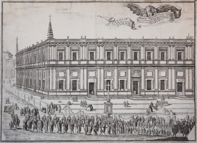 Título: Grabado de la Casa Lonja de Sevilla, Tortolero, 1738. Fuente: Biblioteca Nacional de España.