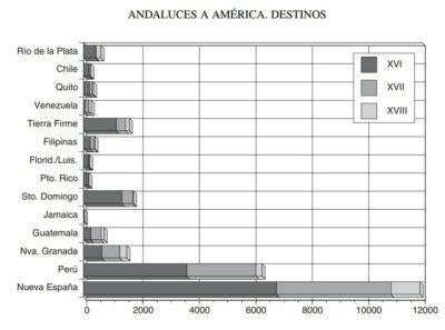 El destino preferente continuó siendo el virreinato de Nueva España (3.730), seguido del virreinato peruano (2.303), aunque, como en el siglo XVI, los andaluces se repartieron por todo el territorio del Imperio español. Estas cantidades, como los destinos correspondientes al siglo XVI, necesitan ser matizadas en cuanto que no en todos los pasajeros registrados figuraba el destino. Muchos de los que solicitaron ir a Nueva España o a Perú se establecieron respectivamente en Méjico y en Lima. El padrón, elaborado en México por el Virrey duque de la Palata en 1689, recoge la presencia de 1.068 españoles peninsulares y 300 de ellos eran andaluces. Por otra parte, Santo Domingo fue lugar de alto poblamiento andaluz con 387 personas que podrían significar casi el 20% de la población, según las cifras de Antonio Vázquez de Espinosa. También tuvieron un notable poblamiento andaluz Guatemala, corroborado por las fuentes de carácter particular, al menos en el caso de Córdoba. Muy distanciadas de estas zonas como lugares preferidos figuran Nueva Granada, Tierra Firme y Quito, y lugares especialmente poco poblados de andaluces fueron Argentina y Chile.