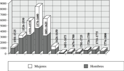 Durante el siglo XVII, en el que hemos identificado a 10.081 andaluces registrados en la Casa de Contratación, se produjo un descenso claro en torno a 1640-1650, que debe estar relacionado con la actitud de la corona, más reacia a conceder licencias de salida de una España demográficamente necesitada. Se habían ido durante el siglo XVI muchas familias, con muchos hijos pequeños, sobre todo en la segunda mitad; habían salido muchos solteros jóvenes en buena edad de procrear; se habían ido, probablemente, los que eran más capaces de arriesgarse y de emprender negocios. En toda España se sufrían los efectos cuantitativos y cualitativos de estas salidas, y también los provocados por las constantes demandas de la política exterior de los grandes reyes de la casa de Austria.