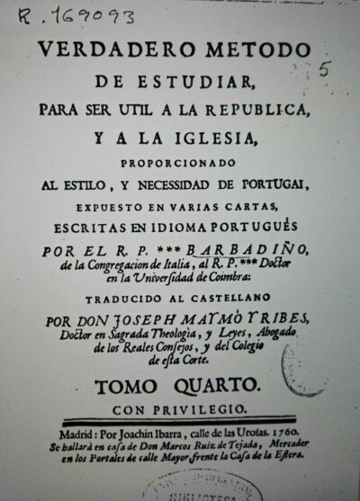 Título: Luis Antonio Verney, Verdadero método de estudiar… (1760). Fuente: http: books.google.es