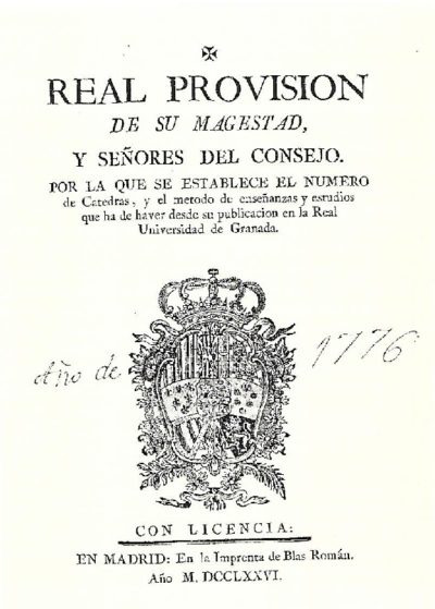 Título: Real Provisión que aprueba el Plan de Estudios de 1776. Fuente: ARIAS de SAAVEDRA ALÍAS, Inmaculada, Plan de estudios de la Universidad de Granada en 1776, Granada, Universidad de Granada, 1996.