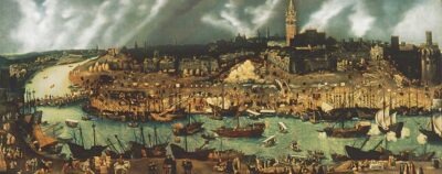 Título: Vista de la ciudad de Sevilla. Finales del siglo XVI. Óleo sobre lienzo, 146 x 295 cm. Atribuído a Alonso Sánchez Coello. Fuente: Museo Nacional del Prado