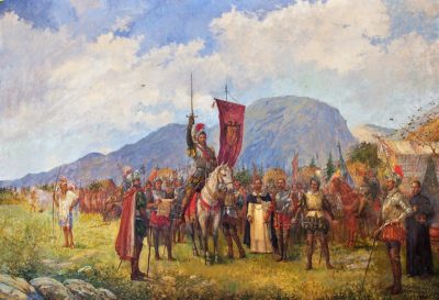 Título: Fundación de la ciudad de Santa Fe de Bogotá, óleo de Pedro Quijano (1938). Fuente: Academia Colombiana de Historia