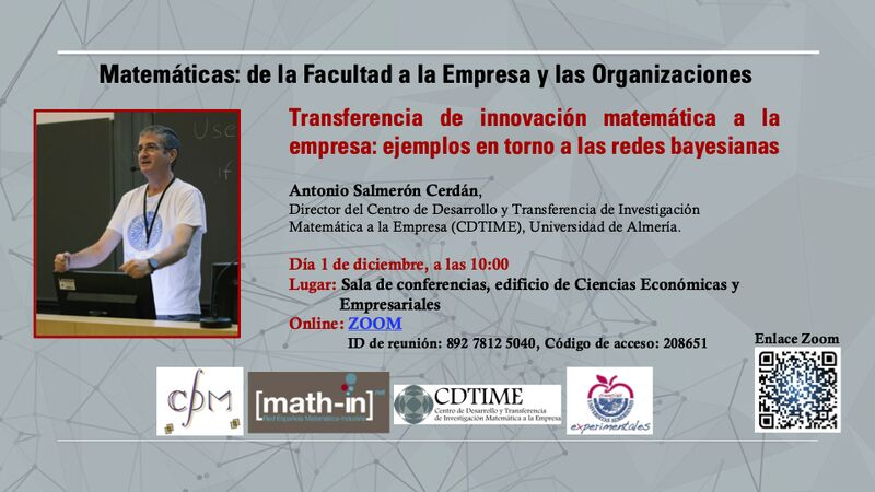 La Conferencia de Decanos de Matemáticas y math-in (Red Española Matemática-Industria) coorganiza el ciclo de conferencias «Matemáticas: de la Facultad a la Empresa y las Organizaciones». La primera conferencia del curso académico la impartirá Antonio Salmerón Cerdán, director del CDTIME.