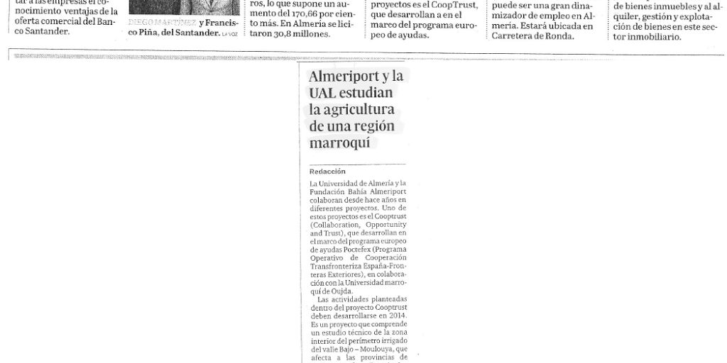 jun12014Prensa Categoría: Prensa%d 01UTC %B 01UTC %Y Autor: cooptrust Navegación entre publicacionesAnteriorPublicación anterior:«Almería contrataca a Motril en su relación con Nador.»SiguientePublicación siguiente:Reuniones de coordinación del Proyecto COOPTRUSTRelated PostsCurso: MEJORA DE LA CAPACIDAD DEINNOVACIÓN Y DESARROLLO TECNOLÓGICO A TRAVÉS DE LA IMPLANTACIÓN DESISTEMAS CAD (COMPUTER AIDED DESIGN)29/06/2015saberuniversidad.es: «Marruecos es una oportunidad, no una amenaza»16/03/2015lavozdealmeria.es: El campo almeriense ya roza las 30.000 hectáreas de invernadero14/03/2015elvigia.com: España toma ventaja para ofrecer servicios de transporte multimodal en Marruecos- 30.01.1503/03/2015marportactivities.com: Éxito de la jornada sobre promoción del transporte marítimo de corta distancia en el Puerto de Almería.25/02/2015lavozdealmeria.es: El ‘Plan Africa’ abrirá oportunidades a la tecnología agraria almeriense21/02/2015