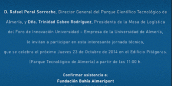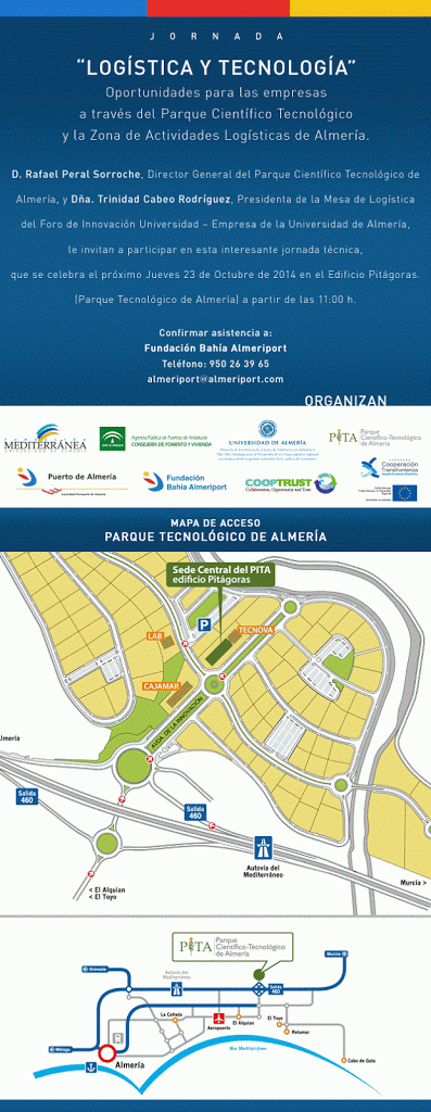El Proyecto COOPTRUST participa en la Jornada “LOGÍSTICA Y TECNOLOGÍA” Oportunidades para las empresas a través del Parque Científico tecnológico y la Zona de Actividades Logísticas de Almería, que se celebra el próximo jueves 23 de octubre de 2014 en el Edifico Pitágoras (Parque Tecnológico de Almería a partir de las 11:00 h).