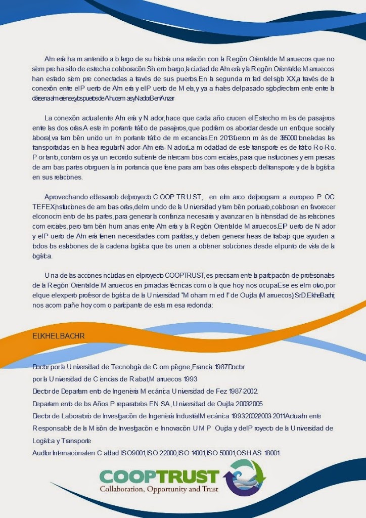 oct222014Sin categoría Categoría: Sin categoría%d 22UTC %B 22UTC %Y Autor: cooptrust Navegación entre publicacionesAnteriorPublicación anterior:Segunda reunión de Coordinación de los equipos de trabajo del COOPTRUST (21.10.2014)SiguientePublicación siguiente:novapolis.es: El PITA, la UAL y el Puerto analizan las nuevas tecnologías aplicadas a la logísticaRelated PostsArtículo “Estimación de la erosión potencial en la cuenca del río Moulouya aguas arriba de la presa Mohamed V”28/01/2015Fotos Curso en la Universidad Mohamed I de Oujda28/01/2015DIARIO MARÍTIMAS24/01/2015revistamercados.com: Fruit Attraction 2015: del 28 al 30 de octubre.21/11/2014revistamercados.com: Avances en los acuerdos de la UE con terceros países.21/11/2014“Proyecto COOPTRUST: La estrecha colaboración entre Oujda y Almería” Agricultura 2000, Número extraordinario_Noviembre de 2014, Agricultura mediterránea: La estrategia de la cooperación.19/11/2014