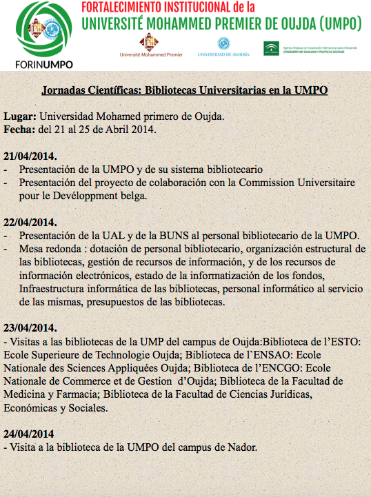Programa de la jornada: Bibliotecas Universitarias en la UMPO admin24 febrero, 201624 febrero, 2016 jornadas No hay comentarios jornadas ← Investigadores Seminario para la formación y capacitación: Biotecnología: microalgas y dinoflagelados en la UAL → Deja una respuesta Cancelar la respuestaTu dirección de correo electrónico no será publicada. Los campos obligatorios están marcados con *Comentario * Nombre * Correo electrónico * Web Guarda mi nombre, correo electrónico y web en este navegador para la próxima vez que comente.