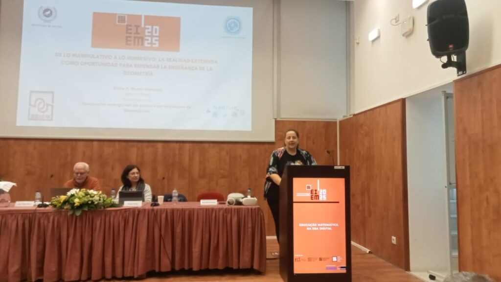 En este contexto, la Dra. Silvia Moral-Sánchez presentó un panel plenario con la conferencia “De lo manipulativo a lo inmersivo: la Realidad Extendida como oportunidad para repensar la enseñanza de la geometría”, donde destacó el papel clave de Neotrie VR, la plataforma de geometría dinámica en realidad virtual que permite al alumnado construir, manipular y explorar objetos matemáticos en un entorno tridimensional inmersivo.