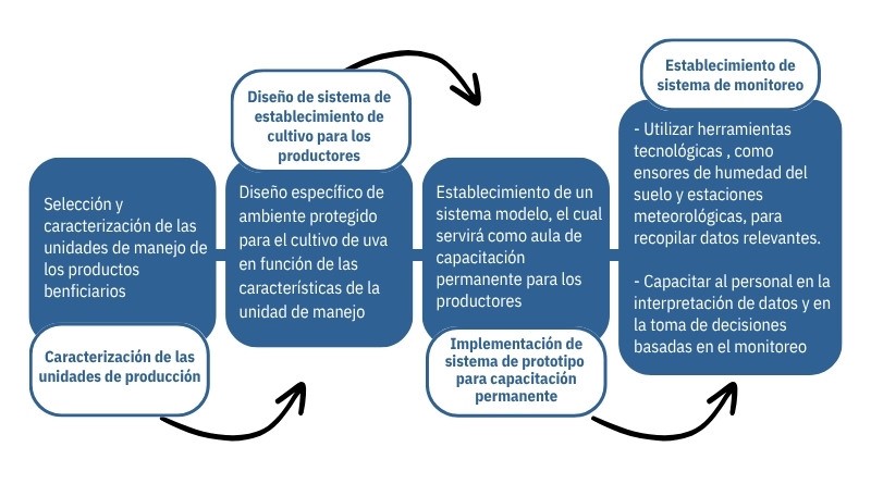 A partir del diagnóstico, se ha creado un plan técnico para el establecimiento del cultivo de uva en ambiente protegido. Este diseño incluye: